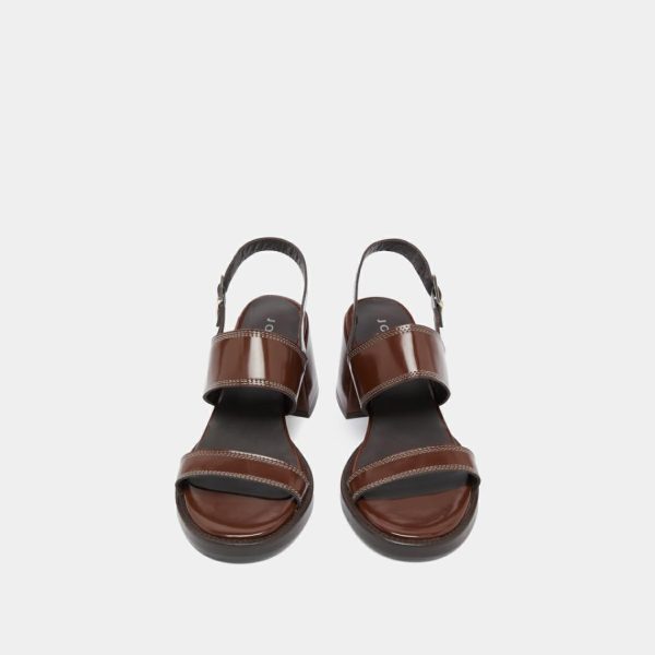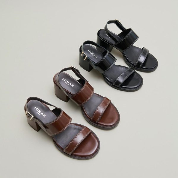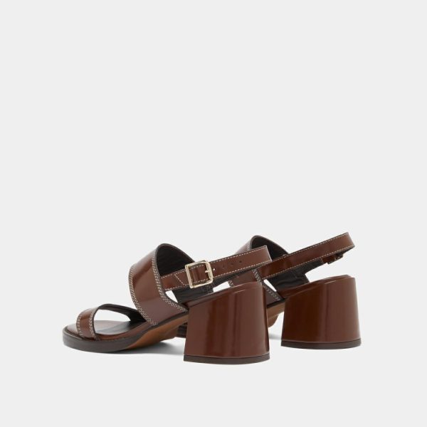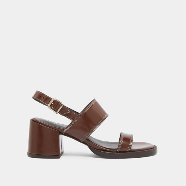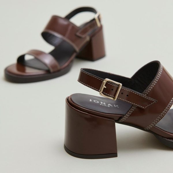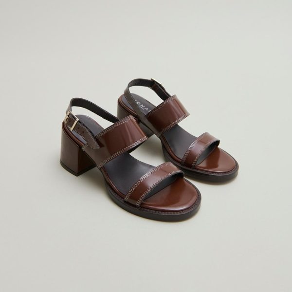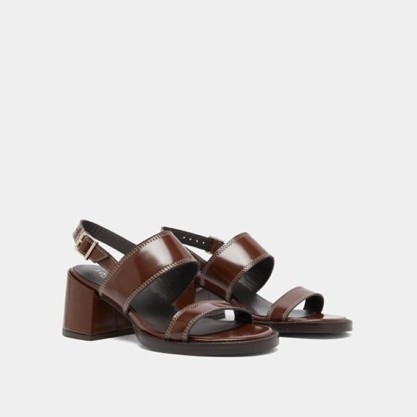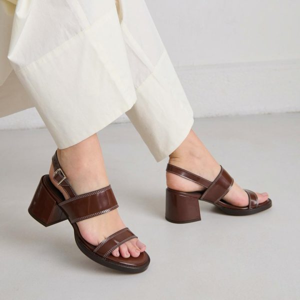 Our BLONDINE heeled sandals capture the essence of summer sophistication with their rich dark brown glazed leather construction. Expertly placed topstitching accentuates every detail, showcasing exceptional craftsmanship throughout. The fully covered heels, crafted from the same premium glazed leather, create a seamless elegant look with a luxury finish.