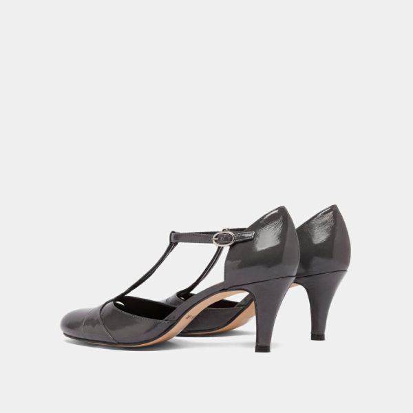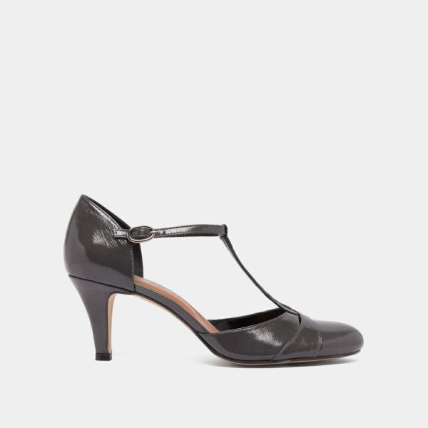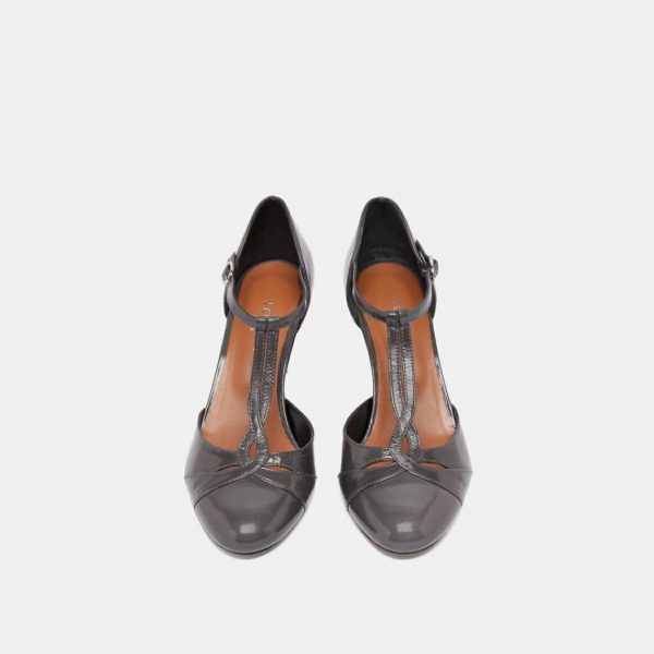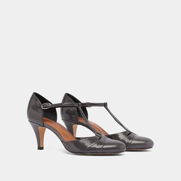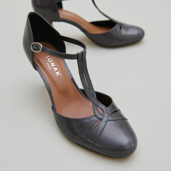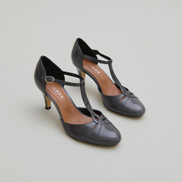 Elevate your style with the sophisticated VERMEIL pumps, featuring a sleek heel and elegant design. These stunning shoes showcase two gracefully overlapping front straps complemented by an adjustable ankle strap with a custom-fit buckle for personalized comfort. The refined oval toe shape combined with premium leather construction delivers undeniable elegance perfect for any occasion. The lustrous gray leather finish adds a touch of radiant shine to your ensemble.